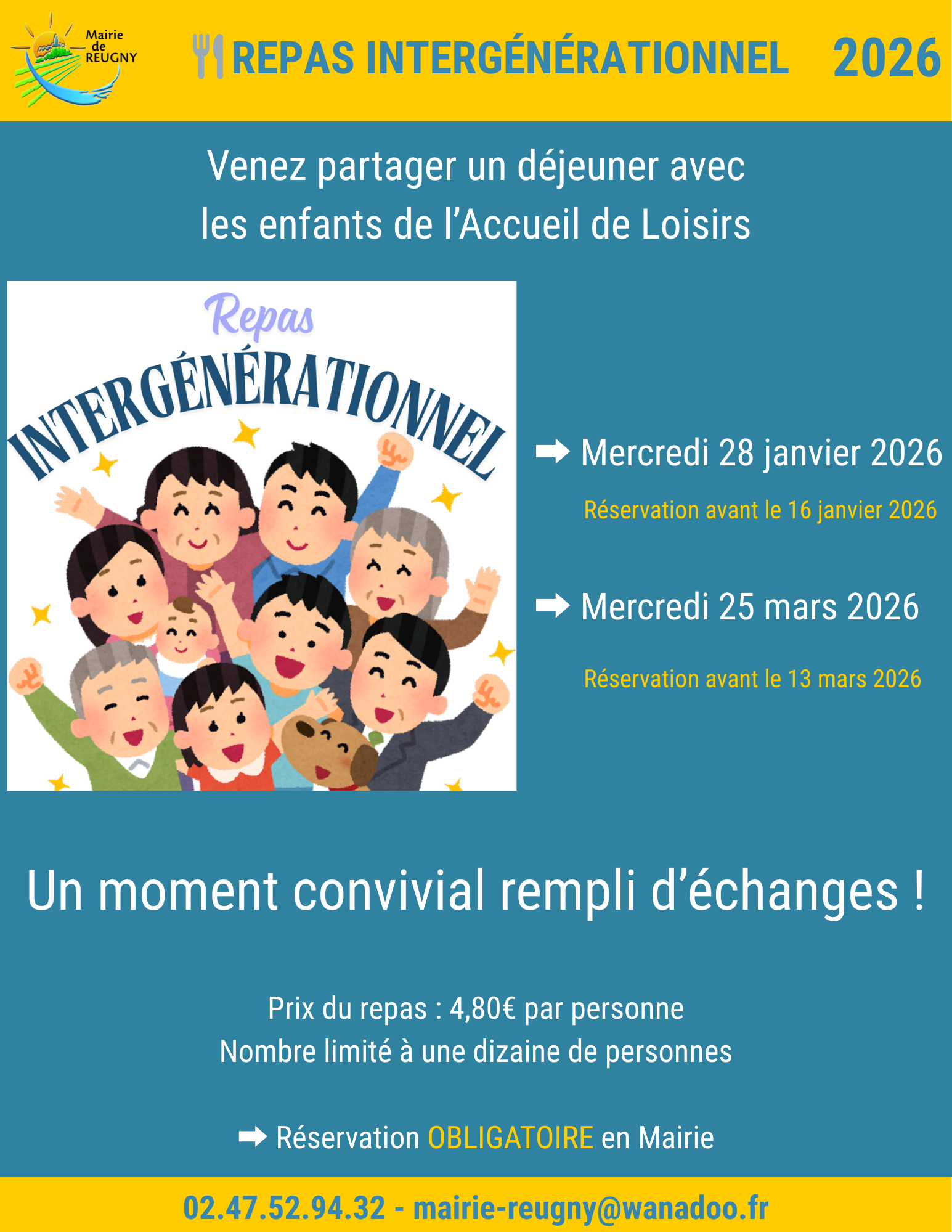 ➡ Réservation OBLIGATOIRE en Mairie avant le 16 janvier 2026 via 0247529432 ou mairie-reugny@wanadoo.fr