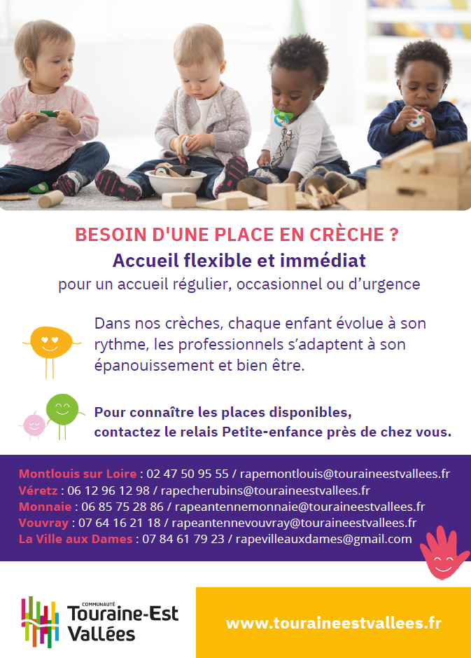 Accueil régulier, occasionnel ou d’urgence,la Communauté de Communes Touraine-Est Vallées nous informe que des places sont disponibles dans les multi accueils.