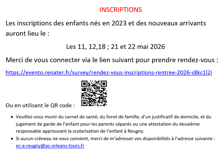 ⚠️ Si aucun créneau ne convient, vous pouvez adresser un mail à la directrice de l’école, Béatrice RICHARD à l’adresse suivante : ec-a-reugny@ac-orleans-tours.fr.